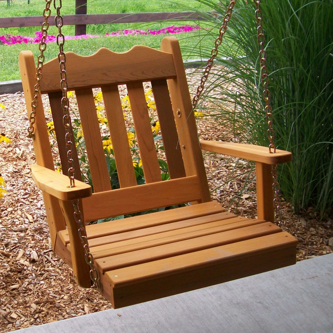 Swing your troubles away with the A & L Furniture Western Red Cedar Royal English 2 ft. Chair Swing with Chains. This swing is constructed of hand-selected western red cedar wood, considered to be the best of the cedar family, and comes in your choice of weather-resistant finish. Each wood plank is chosen by expert Amish craftsmen and constructed using exceptional and traditional woodworking tools right in Pennsylvania. Standard hanging chains are included to attach this swing to the ceiling of your deck, balcony, or gazebo. The seat is 2 feet in length, giving you a cozy yet comfortable swinging seat. This swing comes in a slat-back design with subtle arching details on the back and complements nearly any home exterior. Grab a drink, take a seat, and soak in the relaxing rhythm of your own personal swing chair. This product is proudly Made in the USA by Amish craftsmen. Dimensions: 29L x 27W x 27H inches.
