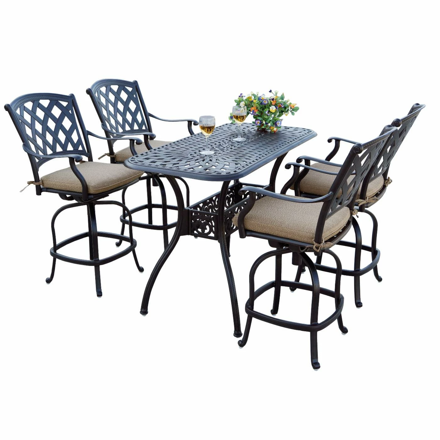 The bar stools are crafted of cast aluminum that’s fully welded for the best in durability. An antique bronze finish is neither too light nor too dark, and this set of two stools comes complete with sesame-colored seat cushions upholstered in durable outdoor-friendly fabric.