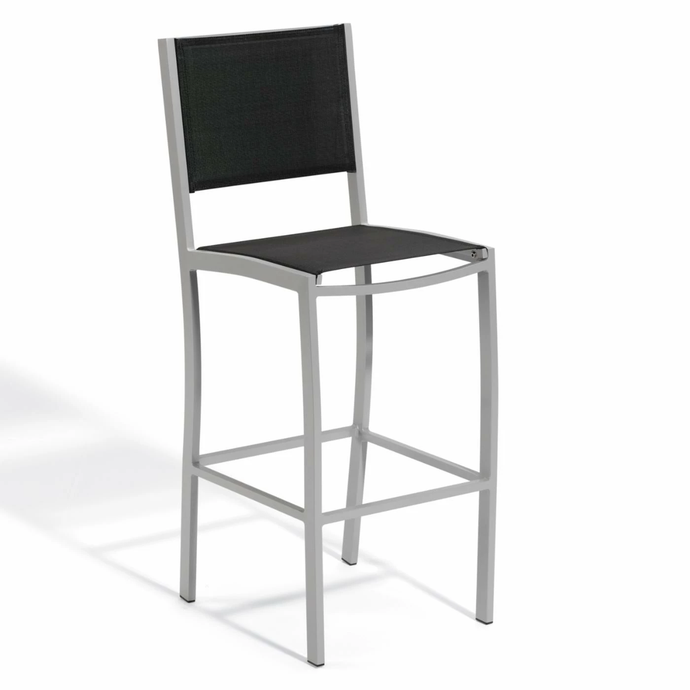Seat outdoor bar guests in style on the Oxford Garden Travira Sling Bar Chair. Its contemporary design includes a gray powder coat flint aluminum frame and comfortable sling-style seat and back. The seat and back come in available color options and are made of Textilene, the industry standard for commercial-grade sling fabric. Stretchers add support and double as convenient footrests. No assembly is required.