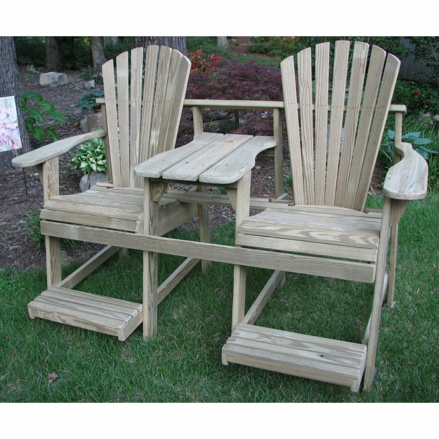 Whether it’s for your balcony or your backyard, the Weathercraft Adirondack Double Seater Balcony Height Tete-A-Tete with Umbrella Hole – Unfinished takes a twosome to new heights of relaxation. Crafted with premium-grade pressure-treated wood, this one-piece, two-seater Adirondack design hosts two at a balcony height with a little table in between. A 1 5/8-inch umbrella hole is built into the central table, too, so a cozy pair can add shade with ease. Untreated, the wood will weather to a soft gray patina. Galvanized bolts, washers, and nuts; stainless steel brad nails; and specially coated screws will withstand weather over time, too. Ships 95% factory assembled; just reattach the back with eight screws. Dimensions: 66.5L x 34W x 46.75H inches. Each seat measures: 20L x 19W inches. Product weight: 98 lbs.