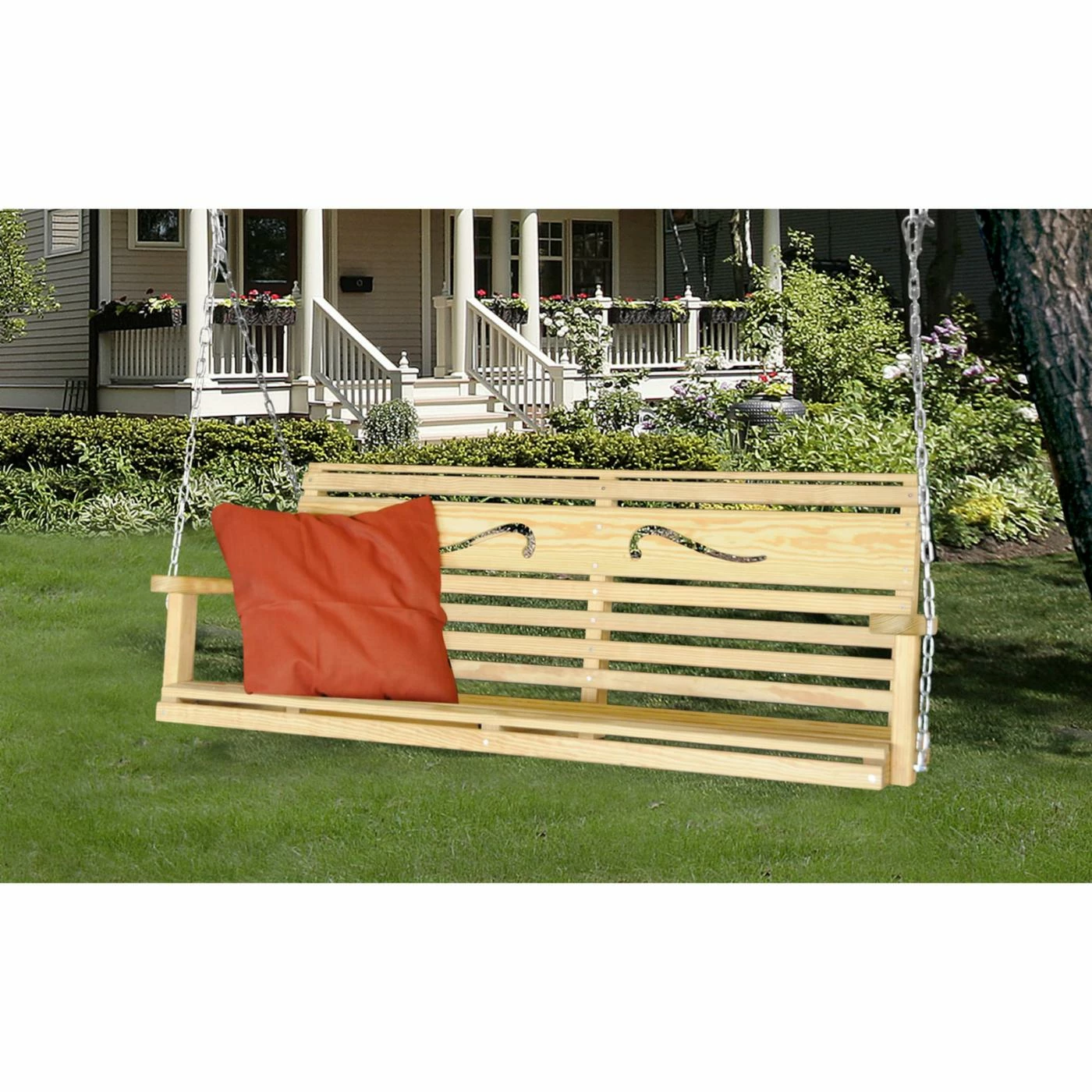 The Hershy Way 5 Ft. Classic Scroll Porch Swing – Natural allows you to enjoy an evening outdoors without going far from home. This porch swing is durably constructed from treated yellow pine wood. The slatted design is accented with carved scrolls on the backrest. The seat will comfortably accommodate up to three people. Hanging chain is included for easy installation.