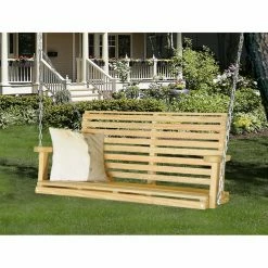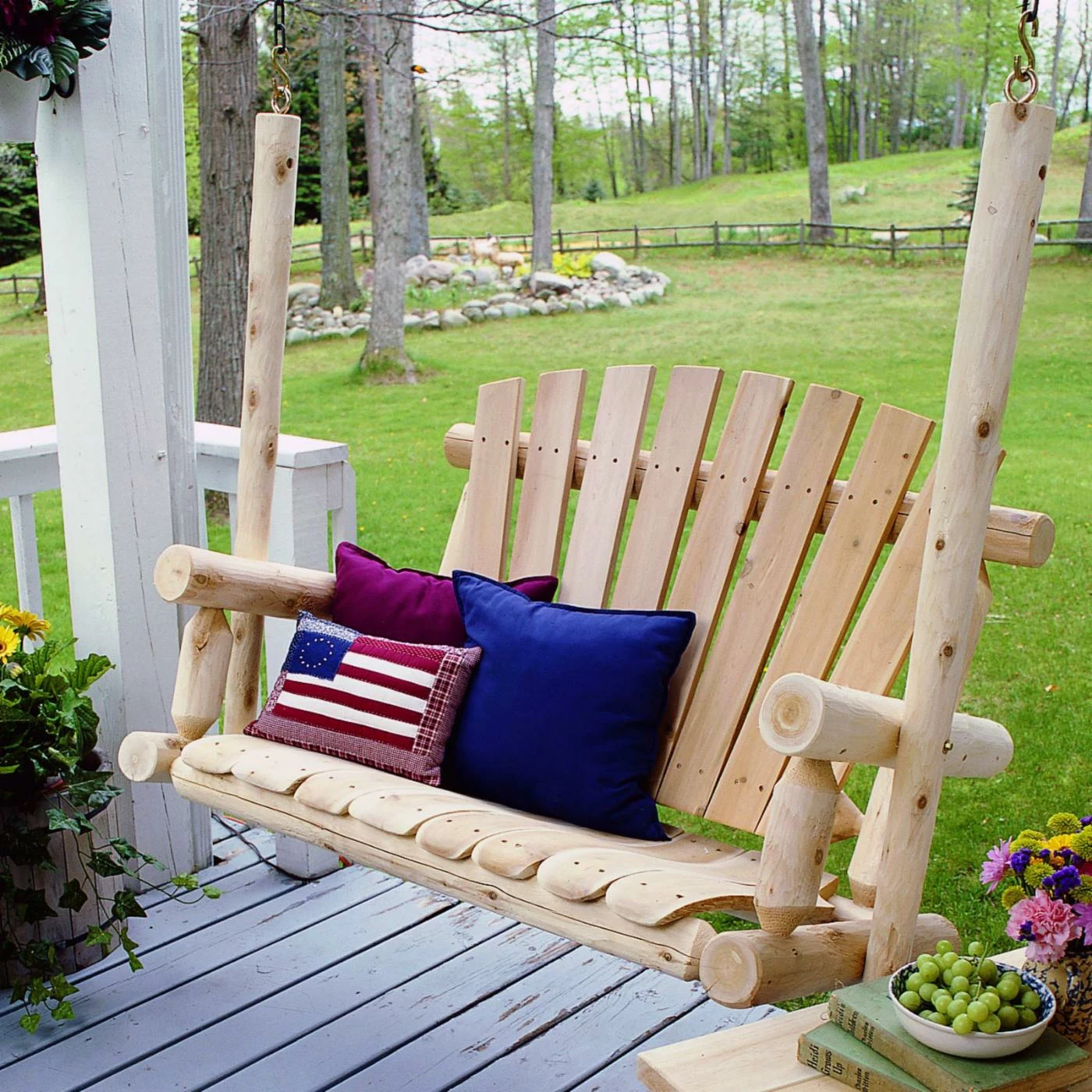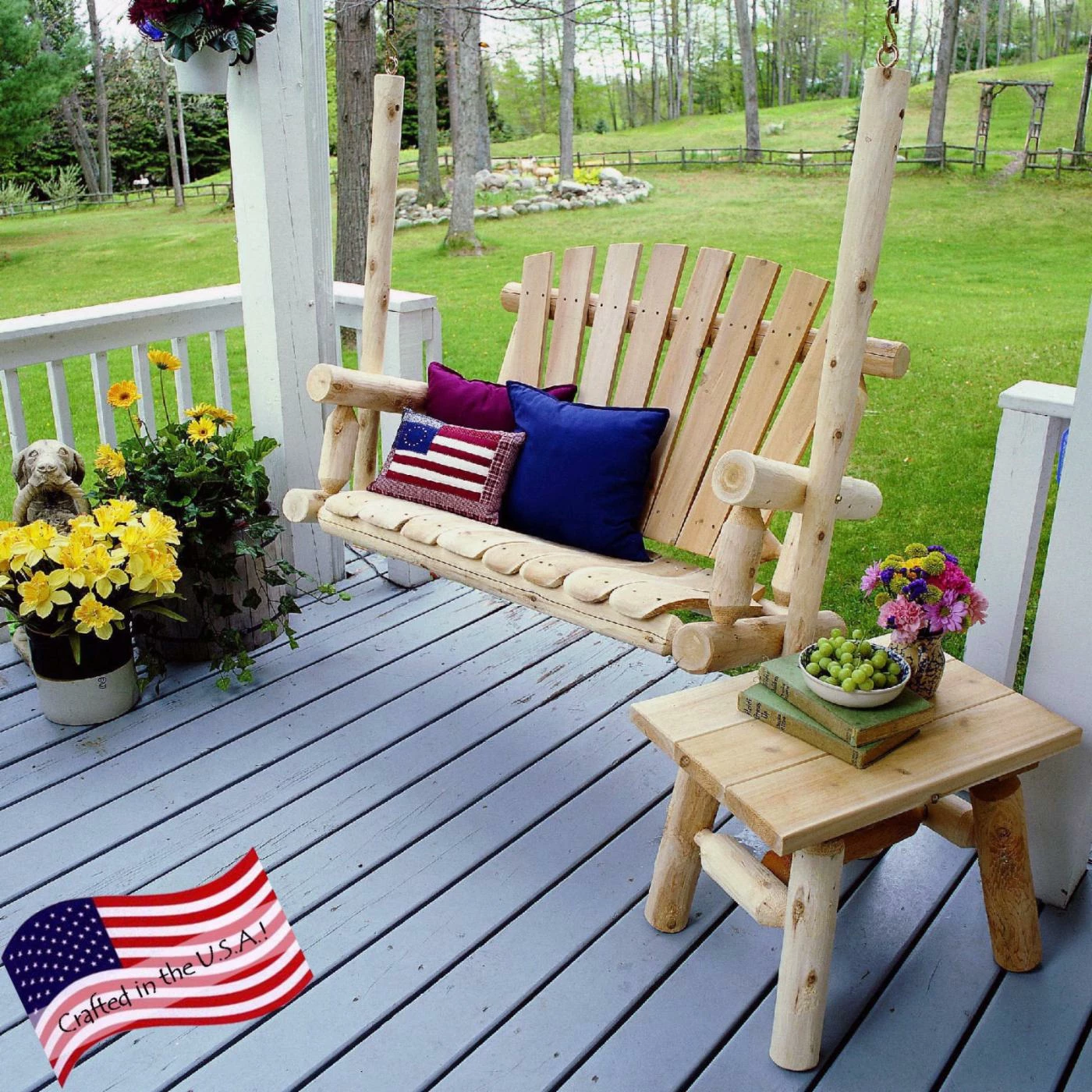 Lakeland Mills Cottonwood Creek Porch Swing. Β Need a place to relax after a busy day?Β ThisPorch Swing adds that homey look to your porch while offering you and yours unbelievable comfort. The swing is constructed with custom contoured seat slats adding to your comfort and support. Made of 100% Northern White Cedar, the wood is naturally resistant to rot and insect damage. Easily hangs from an existing support beam, tree, or our 4 or 5 ft. Β A-Frame.Β Our swing can be finished with a quality penetrating oil, or left to weather to a silvery grey color. Many, or most of the logs will have cracks. These cracks are called checks. Checking occurs when the logs dry and the cells shrink causing the wood to split. This does not weaken the wood. Checking helps give cedar furniture its rustic beauty. **4 or 5 ft.Β A-Frame sold seperately. Made in the USA.