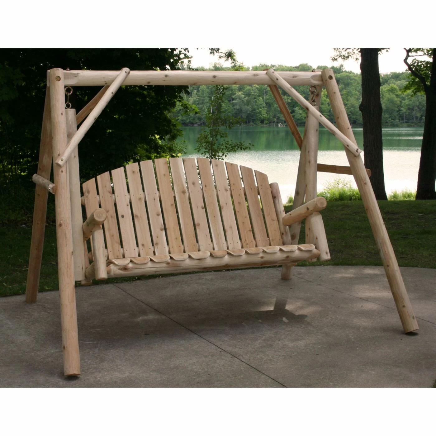 Find a new getaway in your own backyard with the Lakeland Mills Country Garden Swing and Stand Set. With both a swing and an A-frame, this set can transform your outdoor space into a relaxing retreat. Both pieces are constructed from 100% Northern White Cedar, and the swing features custom contoured seat slats for superior comfort and support. White cedar is naturally resistant to both rot and insect damage, so it can remain durable in all climates and settings. Unfinished, it naturally weathers to a silvery grey color. This color, combined with the gradual checking of the wood, lends an inviting rustic beauty to both the swing and the frame. Made in the USA. Ships partially assembled. Dimensions: 87L x 70W x 66H inches.